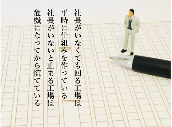 平時ほど生産以外の時間を確保し、現場は社員だけでも回る仕組みを構築しておかなければいけません。今、会社が存在しているのであれば、過去に厳しい状況を乗り越えた経験があると思います。その時になぜ乗り越えられたのか、仕組みなどなく社長や特定の優秀な社員のその場の対応により乗り越えられていたとしたら、それを具体的にし、属人化したものではなく会社全体で取り組める仕組みに置き換えておくことは、危機的な状況に対応するために必要な準備ではないでしょうか。