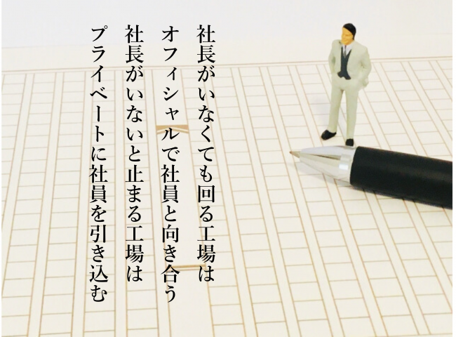 ただ、業務時間内は社員にも仕事があります。たまに社長が現場に入り通りすがりの社員を引き留め自分の話を延々する社長を見かけますが、これは社員にとって業務の邪魔でしかありません。同じ様に、社長の一方的な都合で面談機会を設けることも気をつけなければいけません。社員が限られた時間で行った改善の成果は、社長との面談の時間を捻出するために行うのではないのです。したがって、社長が社員との面談の機会を設けたいと思うのであれば、社員の業務に影響がないよう、社長がなんらかの改善を行なって時間を生み出してあげなければいけません。それをした上でなければ、社員に何を言っても響くことはないでしょう。